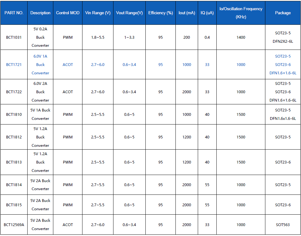 为应对这一需求,BROADCHIP推出的BCT1721同步降压转换器,集成先进的ACOT(自适应恒定导通时间)控制架构支持更快的瞬态响应,具备1MHz高开关频率、高达95%的转换效率,并内置多重保护功能。该器件采用超小封装,进一步拓展了我司DCDC低压芯片产品系列,是下一代紧凑型电子设备的理想“能量心脏”,广泛应用于安防摄像头、行车记录仪、STB、IP电话、POS机等应用领域。