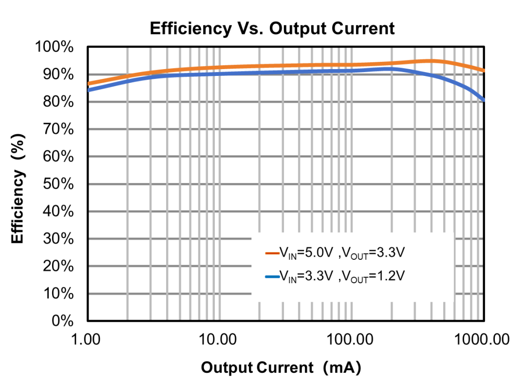 95%的峰值效率:采用同步整流技术,内部集成低导通电阻的功率MOSFET(上管260mΩ,下管150mΩ),显著降低能量损耗,延长设备续航。下图为其效率与输出电流的曲线。