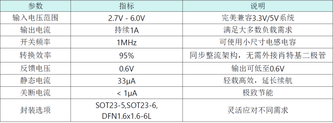 超低静态电流:关断模式下电流低于1μA,理想用于电池供电场景,助力产品实现更优的待机功耗表现。