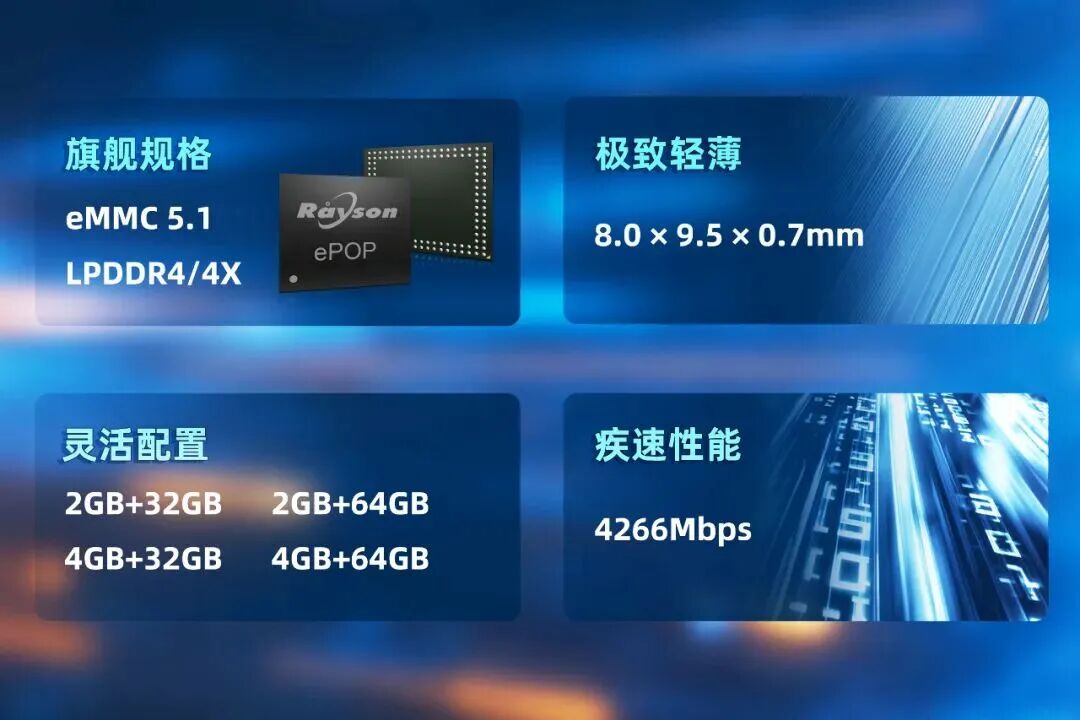 ePOP 存储芯片采用先进的 POP(Package on Package,层叠式封装)技术,整体尺寸仅 8.0 mm × 9.5 mm,厚度最薄可达 0.7 mm,相比传统分立式存储方案大幅缩小。这样“指甲盖般”的微小体积,不仅精准契合智能穿戴设备对内部空间的极致要求,也为终端厂商在外观设计与结构堆叠上释放更多可能。