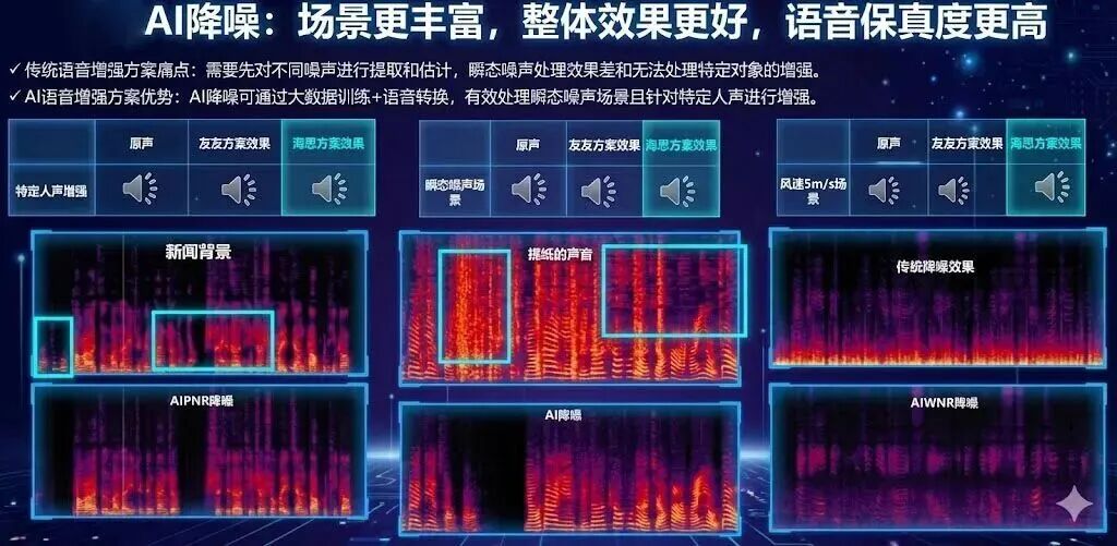 在AI降噪方面,上海海思谛听方案集成了基于AI的智能降噪技术,通过端侧AI算力,实现精准降噪,这一技术还可以和星闪传输形成“分工协同”:AI降噪负责“净化”音频源,星闪负责“无损传输”净化后的信号。